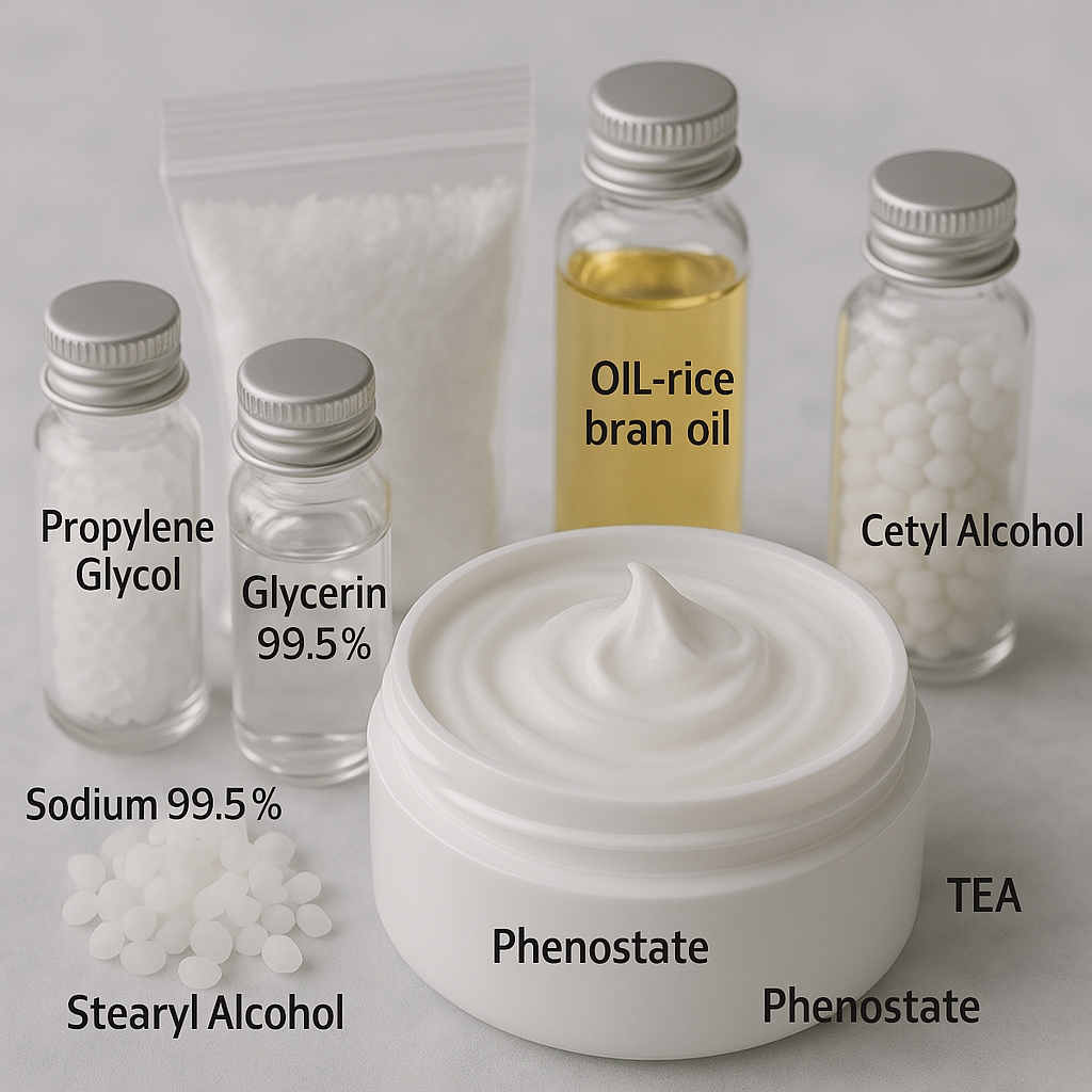 EDTA-2NA, Propylene Glycol, Glycerin 99.5%, Sodium Stearate, GMS, Tween-20, Stearic Acid 1852, Cetyl Alcohol, Stearyl Alcohol, Rice Bran Oil, Phenostate, TEA